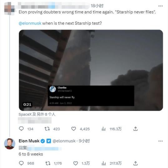 馬斯克在推特上回應有關(guān)星際飛船最新進(jìn)展時(shí)表示,下一次測試將在“6 到 8 周內”進(jìn)行。