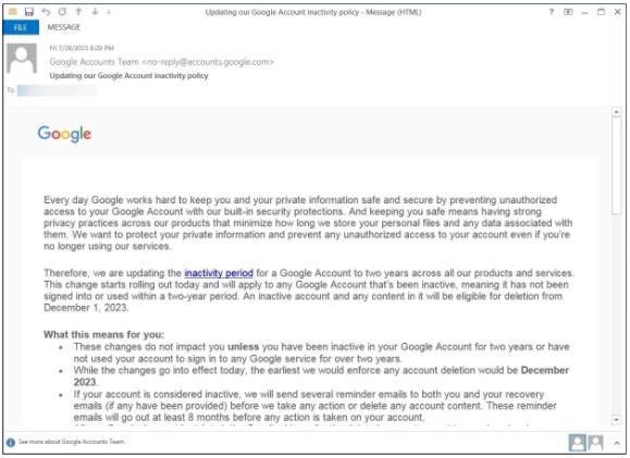 谷歌于上周末向用戶(hù)發(fā)送電子郵件,再次提醒用戶(hù),官方將于 2023 年 12 月 1 日清理連續 2 年未活動(dòng)的休眠賬號。