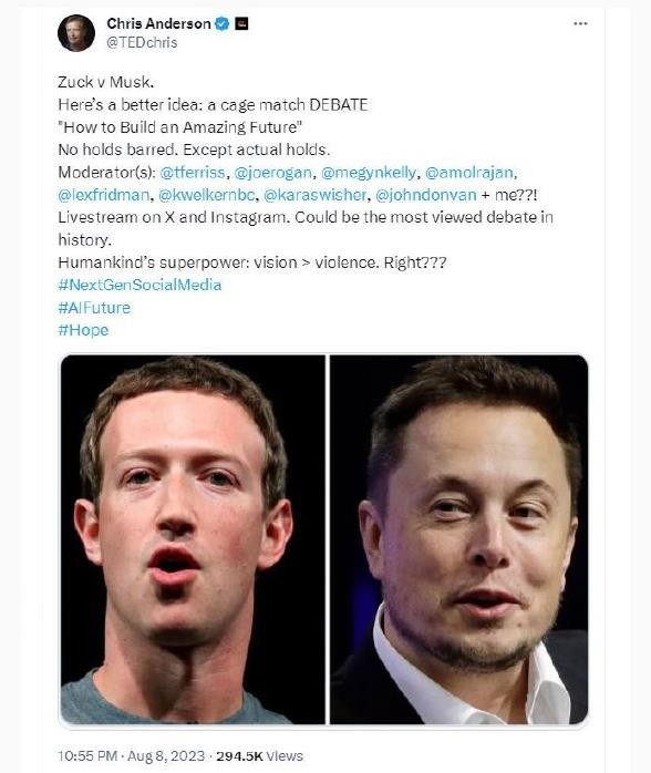 TED 演講創(chuàng )始人克里斯·安德森(Chris Anderson)發(fā)帖,建議馬斯克和扎克伯格把“籠斗”改成一場(chǎng)籠中辯論賽。