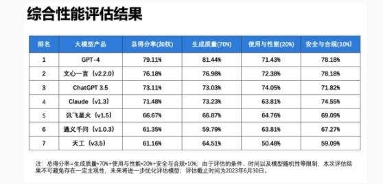 報告本次評估選取了 GPT-4、ChatGPT 3.5、文心一言、通義千問(wèn)、訊飛星火、Claude、天工 7 個(gè)大語(yǔ)言模型,圍繞生成質(zhì)量、使用與性能、安全與合規三大維度,全面考察大語(yǔ)言模型上下文理解、中文語(yǔ)義理解、誤導信息識別、邏輯推理、內容安全性、隱私保護等 20 項指標。