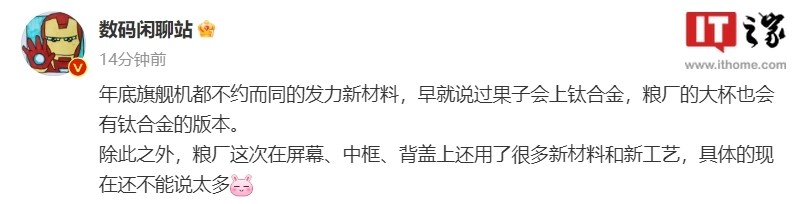 據博主 @數碼閑聊站 透露,除了蘋(píng)果 iPhone15 系列外,小米“大杯”機型也有鈦合金版本。除此之外,小米這次在屏幕、中框、背蓋上還用了很多新材料和新工藝。該博主并未透露產(chǎn)品具體型號,綜合此前的爆料來(lái)看,預計為小米 14 Pro 手機。
