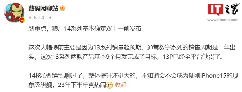 該博主此前爆料稱(chēng),小米 14 系列手機“基本確定”雙十一前發(fā)布,這次大幅提前主要是因為小米 13 系列銷(xiāo)量超預期。該博主還表示,通常小米數字系列的銷(xiāo)售周期是一年出頭,這次小米 13 系列兩款產(chǎn)品基本 9 個(gè)月就完成了目標,小米 13 Pro 已經(jīng)全平臺缺貨了。
