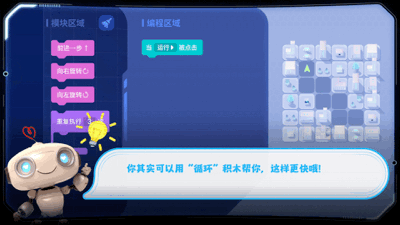 循環(huán)結構的編程知識同樣被隱藏在游戲互動(dòng)中,讓青少年了解如何能提升效率。