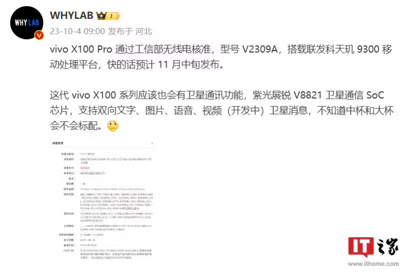 此前一款型號為“V2309A”的 vivo 新機通過(guò)了工信部無(wú)線(xiàn)電核準,預計為 vivo X100 Pro,博主 @WHYLAB 透露這款新機有望搭載衛星通訊功能。