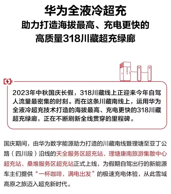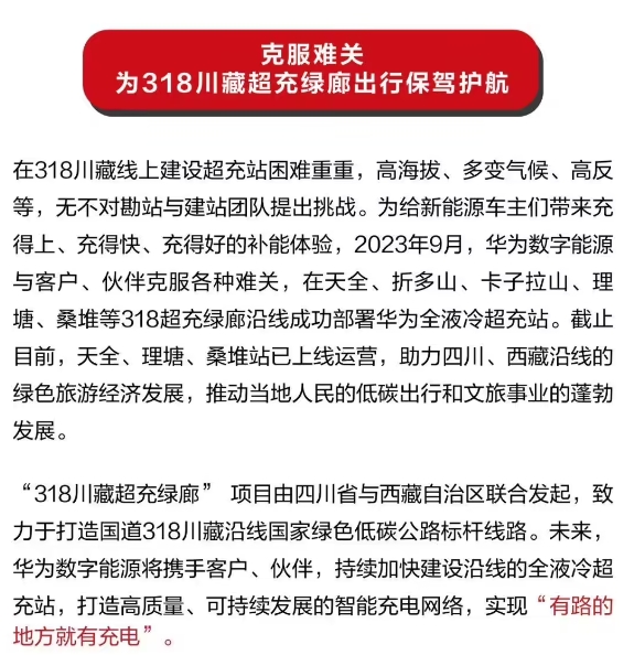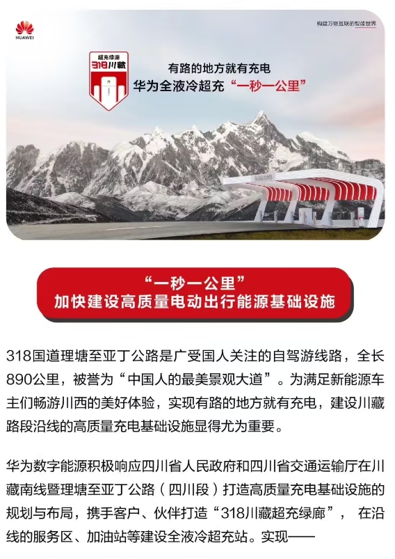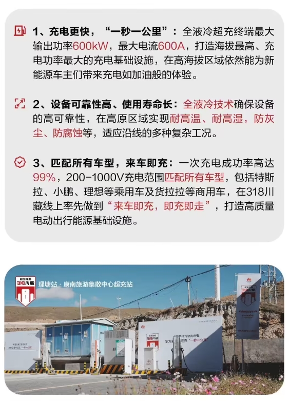 華為全液冷超充站在 318 川藏線(xiàn)理塘、桑堆等地上線(xiàn),號稱(chēng)一秒補充一公里續航