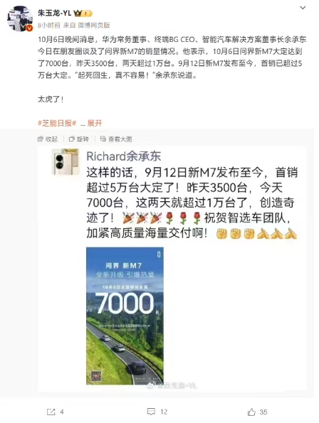 當日,汽車(chē)工程師 @朱玉龍 曬出了一張微信朋友圈截圖:華為常務(wù)董事、終端 BG CEO、智能汽車(chē)解決方案董事長(cháng)余承東發(fā)文談及了問(wèn)界新 M7 的銷(xiāo)量情況。