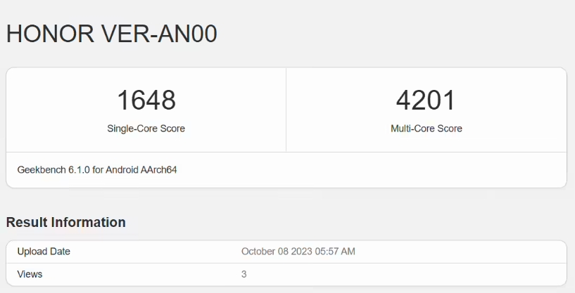 跑分信息顯示,這款新機的單核得分為 1648,多核得分為 4201,搭載安卓 13 系統,測試機型為 16GB 內存版本。