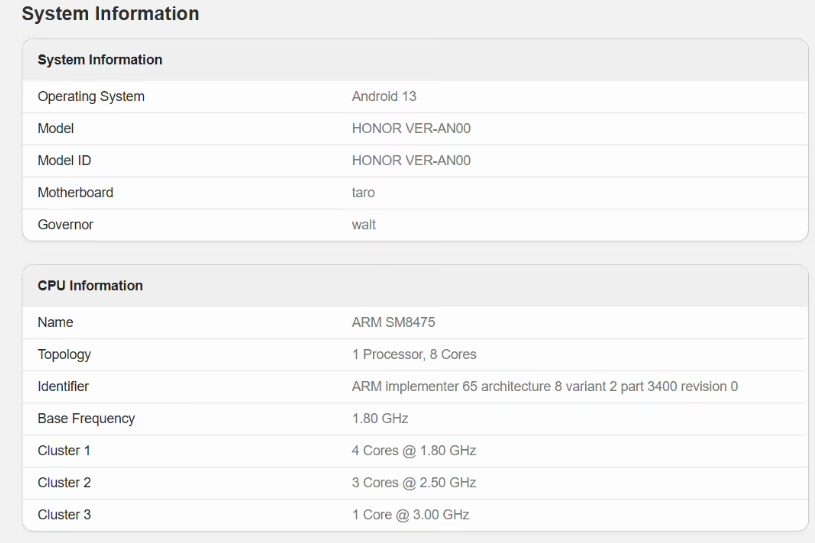 從該網(wǎng)站還可以看到,這款新機搭載驍龍 8 + 處理器降頻版,CPU 由 1 個(gè) 3.00 GHz 核心 + 3 個(gè) 2.50 GHz 核心 + 4 個(gè) 1.80 GHz 核心組成。作為對比,驍龍 8 + 處理器 CPU 由 1 個(gè) 3.2GHz 核心 + 3 個(gè) 2.75GHz 核心 + 4 個(gè) 2.0GHz 核心組成。
