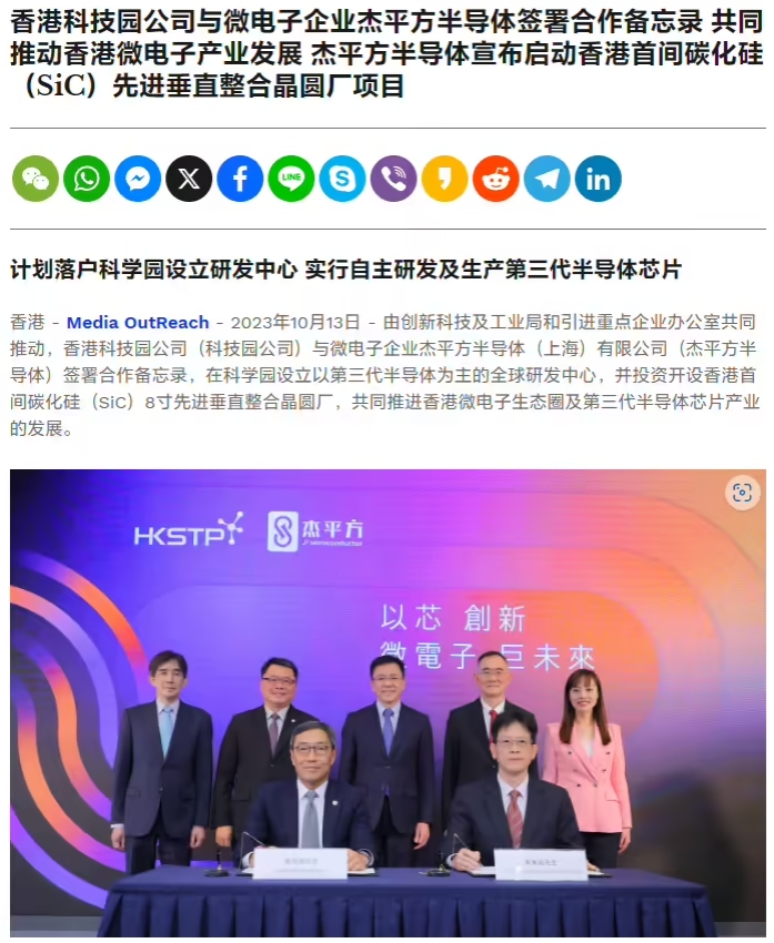 據中新社、香港科技園公司官方,香港科技園公司與微電子企業(yè)杰平方半導體有限公司簽署合作備忘錄,雙方將在香港科學(xué)園設立以第三代半導體為主的全球研發(fā)中心,并投資開(kāi)設香港特別行政區首家碳化硅 8 寸先進(jìn)垂直整合晶圓廠(chǎng)。