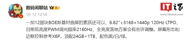 一加 12 將采用京東方新基材曲面屏,屏幕尺寸為 6.82 英寸,分辨率為 3168×1440p,支持 120Hz LTPO 自適應刷新率。此外,該博主還透露,一加 12 的屏幕形態(tài)和邊框控制參考 OPPO Find X6 Pro(注:居中單孔),頂配提供 24GB+1TB 大內存,配色有黑、白、綠三款。