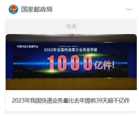 2023 年我國快遞業(yè)務(wù)量突破 1000 億件,比去年提前 39 天 09:55:19