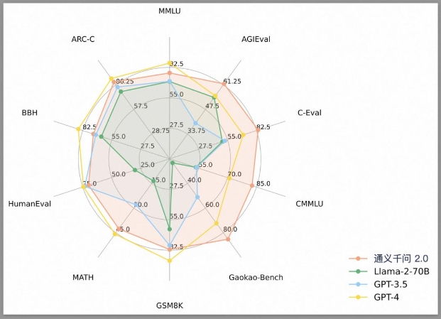 阿里云也亮出了通義千問(wèn)和其他模型的比較結果。在 MMLU、C-Eval、GSM8K、HumanEval、MATH 等 10 個(gè)主流 Benchmark 測評集上,通義千問(wèn) 2.0 的得分整體超越 Meta 的 Llama-2-70B。相比 OpenAI 的 Chat-3.5,是九勝一負;相比 GPT-4 則是四勝六負,與 GPT-4 的差距進(jìn)一步縮小。