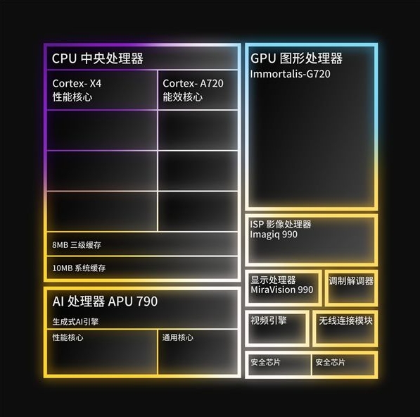 內部還集成聯(lián)發(fā)科第七代 AI 處理器 APU 790,為生成式 AI 而設計,整數運算和浮點(diǎn)運算的性能是前一代的 2 倍,功耗降低了 45%,支持終端運行最高 330 億參數的 AI 大語(yǔ)言模型。