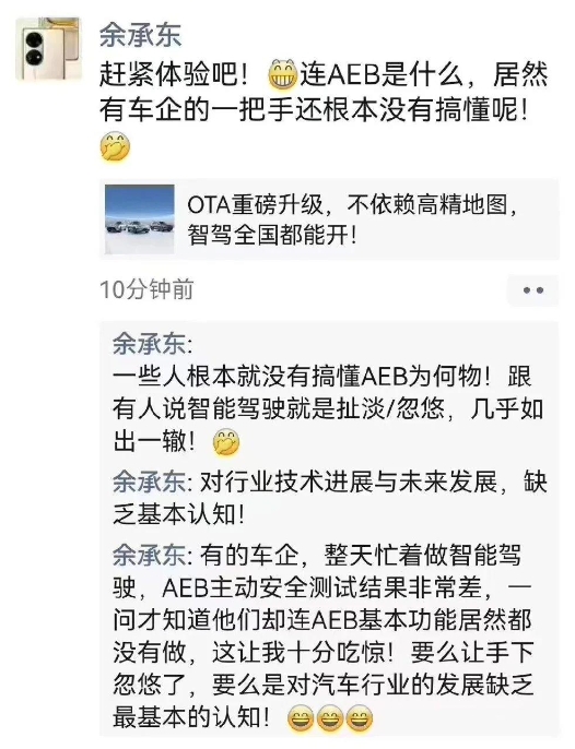 上周五,華為常務(wù)董事、終端 BG CEO、智能汽車(chē)解決方案 BU 董事長(cháng)余承東昨夜通過(guò)朋友圈發(fā)文,矛頭直指“有的車(chē)企”,稱(chēng)其一把手連 AEB(自動(dòng)緊急制動(dòng)系統)是什么都根本沒(méi)有搞懂,對行業(yè)技術(shù)進(jìn)展與未來(lái)發(fā)展缺乏基本認知!