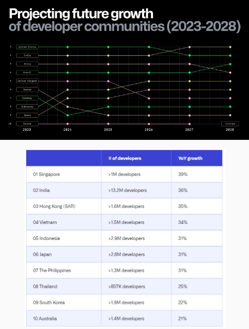 預計到 2027 年,印度將取代美國成為 GitHub 上最大的開(kāi)發(fā)者社區。新加坡今年是亞太地區開(kāi)發(fā)者人數增長(cháng)最快的國家,并且是開(kāi)發(fā)者占總人口的比例最高的第地區(全球范圍內)。報告指出,由于日本在技術(shù)和初創(chuàng )企業(yè)方面的進(jìn)一步投資,明年日本的開(kāi)發(fā)者將有持續增長(cháng)。