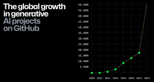 生成式 AI 在 2023 年經(jīng)歷了爆發(fā)式增長(cháng),僅半年內涌現出的生成式 AI 項目數量就已達到了 2022 年全年的兩倍之多。開(kāi)發(fā)人員也開(kāi)始更多地嘗試使用 AI 模型。前幾年,開(kāi)發(fā)人員常使用 tensorflow/tensorflow、pytorch/pytorch 等機器學(xué)習庫構建項目;現在則更多嘗試使用 AI 模型和 LLM(如 ChatGPT API)。