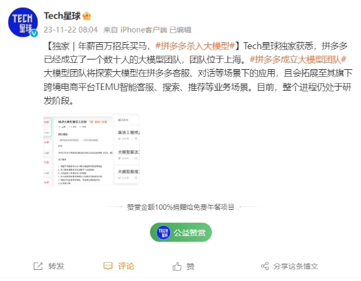 消息稱(chēng)拼多多已殺入大模型領(lǐng)域,年薪百萬(wàn)招兵買(mǎi)馬