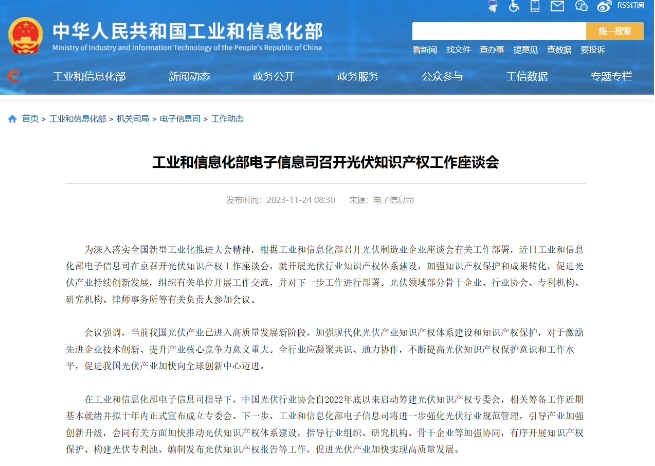據工業(yè)和信息化部官網(wǎng)消息,近日工業(yè)和信息化部電子信息司在京召開(kāi)光伏知識產(chǎn)權工作座談會(huì ),就開(kāi)展光伏行業(yè)知識產(chǎn)權體系建設,加強知識產(chǎn)權保護和成果轉化,促進(jìn)光伏產(chǎn)業(yè)持續創(chuàng )新發(fā)展,組織有關(guān)單位開(kāi)展工作交流,并對下一步工作進(jìn)行部署。光伏領(lǐng)域部分骨干企業(yè)、行業(yè)協(xié)會(huì )、專(zhuān)利機構、研究機構、律師事務(wù)所等有關(guān)負責人參加會(huì )議。