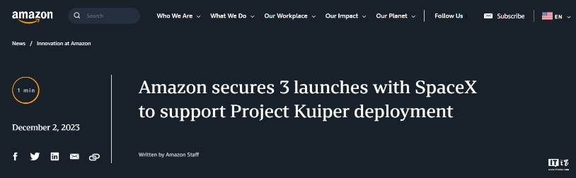 亞馬遜宣布已與 SpaceX 簽署了 3 次獵鷹 9 號發(fā)射合同,以支持亞馬遜低地球軌道(LEO)衛星寬帶網(wǎng)絡(luò ) Project Kuiper(柯伊伯計劃)的部署計劃。
