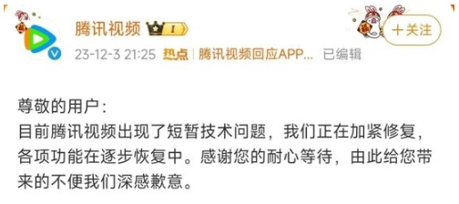騰訊視頻官方微博3日晚發(fā)文稱(chēng),目前騰訊視頻出現了短暫技術(shù)問(wèn)題,正在加緊修復,各項功能在逐步恢復中。