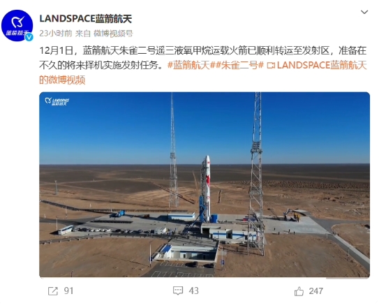 據藍箭航天 12 月 3 日消息,12 月 1 日,藍箭航天朱雀二號遙三液氧甲烷運載火箭已順利轉運至發(fā)射區,準備在不久的將來(lái)?yè)駲C實(shí)施發(fā)射任務(wù)。