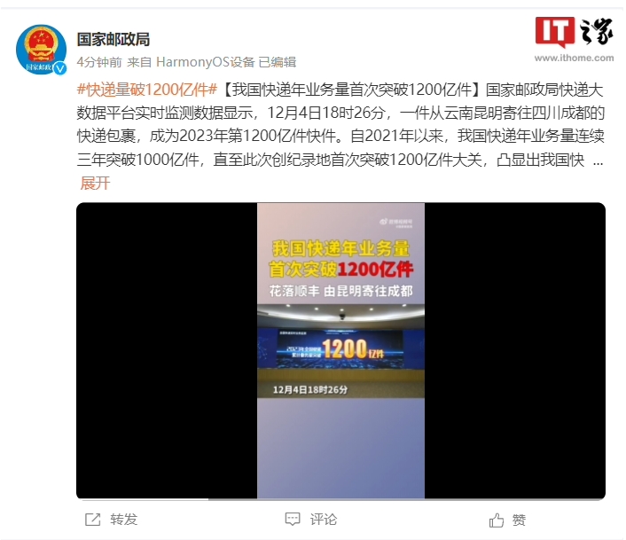 再創(chuàng )新高!我國快遞年業(yè)務(wù)量首次突破 1200 億件