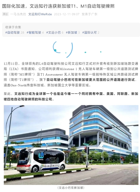 文遠知行獲新加坡 T1、M1 自動(dòng)駕駛牌照,取得同類(lèi)公司當地最快“拿牌”紀錄