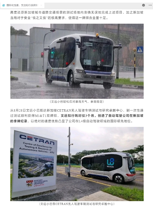 據介紹,文遠小巴 8 月 28 日抵達新加坡 CETRAN 無(wú)人駕駛車(chē)輛測試與研究卓越中心。此次該公司一次性通過(guò)測試并拿到雙牌照,耗時(shí) 3 個(gè)月,號稱(chēng)創(chuàng )造了自動(dòng)駕駛公司在新加坡的拿牌記錄。