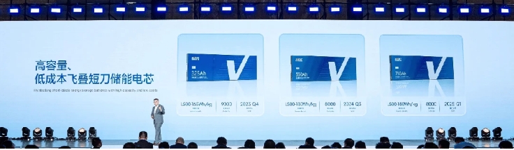 在儲能賽道,蜂巢能源基于“飛疊 + 短刀”更安全的解決方案,發(fā)布全新的飛疊短刀儲能電池迭代產(chǎn)品,包含尺寸不變、體系升級的 350Ah 飛疊短刀儲能專(zhuān)用電芯和尺寸加厚的 710Ah 飛疊短刀儲能電芯,以及三款容量為 310Ah、330Ah、660Ah 的長(cháng)壽命體系儲能電芯,以及全球首款 6Mwh-20 尺集裝箱。