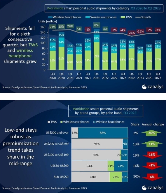 根據市場(chǎng)調查機構 Canalys 公布的最新研報,2023 年第 3 季度全球智能個(gè)人音頻市場(chǎng)出貨量 1.1 億臺,同比下降 3%。