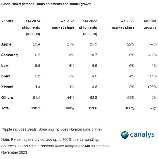 2023Q3 全球個(gè)人音頻市場(chǎng)報告:總出貨量 1.1 億臺,蘋(píng)果 / 三星 / boAt / 索尼 / 小米前五