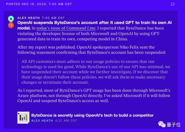 The Verge 表示正在向微軟做進(jìn)一步的咨詢(xún),是否也會(huì )跟 OpenAI 采取同樣的措施暫停字節跳動(dòng)的賬戶(hù)。