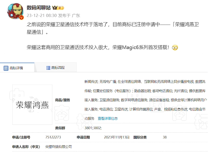 榮耀手機申請“榮耀鴻燕”商標:含衛星通信服務(wù),Magic6 系列有望首發(fā)
