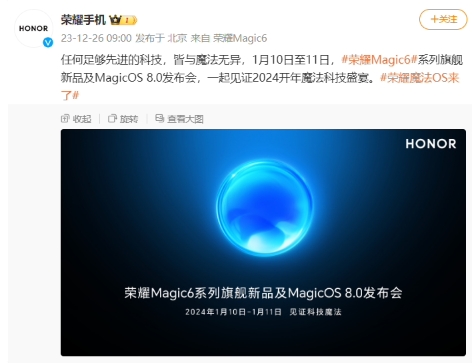 榮耀今日宣布,榮耀 Magic6 系列旗艦新品及 MagicOS 8.0 發(fā)布會(huì )定檔 1 月 10 日至 11 日。