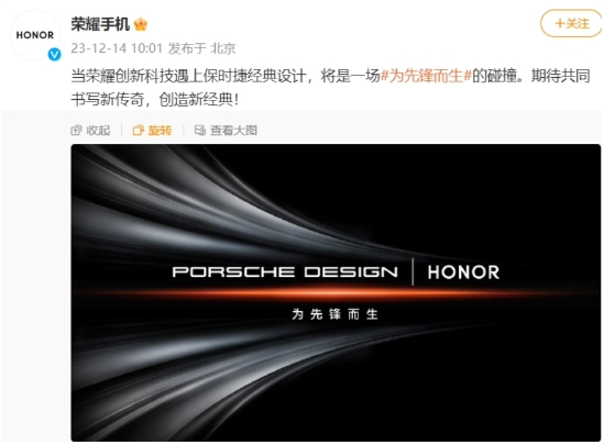 榮耀手機此前已經(jīng)宣布聯(lián)動(dòng)保時(shí)捷設計,slogan 為“為先鋒而生”。