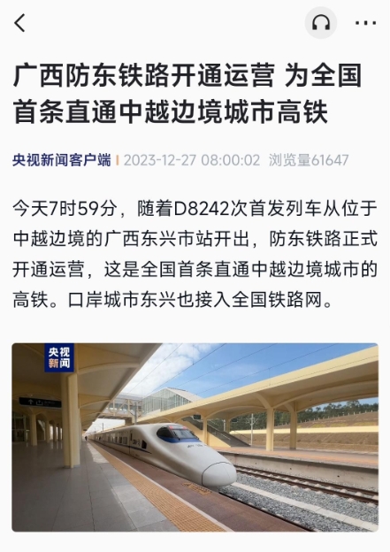 全國首條直通中越邊境城市高鐵,廣西防東鐵路今日起開(kāi)通運營(yíng)