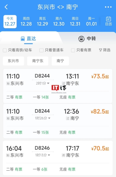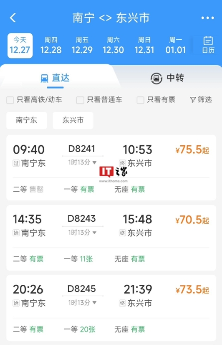 南寧到東興的票價(jià)為 70.5 元起,分別在上午、下午、晚上各有一趟列車(chē)。