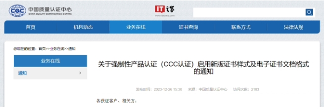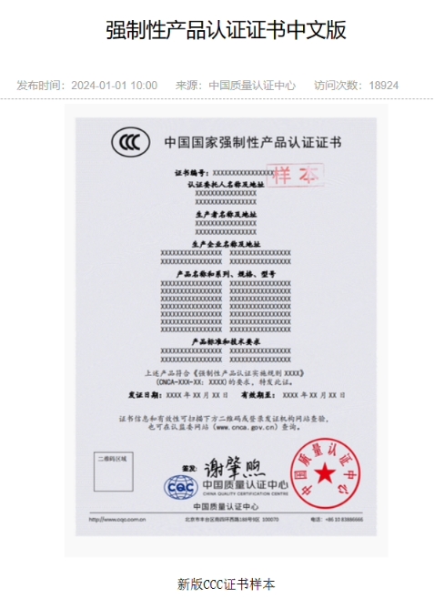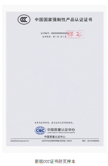 根據《國家認監委關(guān)于完善強制性產(chǎn)品認證證書(shū)和標志管理的公告》(2023 年第 12 號)要求,自 2024 年 1 月 1 日起,中國質(zhì)量認證中心強制性產(chǎn)品認證(CCC 認證)啟用新版證書(shū)樣式及電子證書(shū)文檔格式。