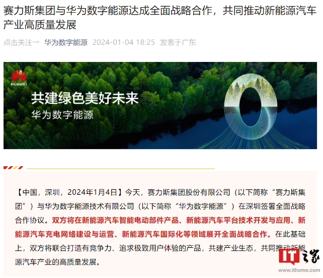 根據此前官方公布的消息,賽力斯與華為數字能源將在新能源汽車(chē)智能電動(dòng)部件產(chǎn)品、新能源汽車(chē)平臺技術(shù)開(kāi)發(fā)與應用、新能源汽車(chē)充電網(wǎng)絡(luò )建設與運營(yíng)、新能源汽車(chē)國際化等領(lǐng)域展開(kāi)全面戰略合作。