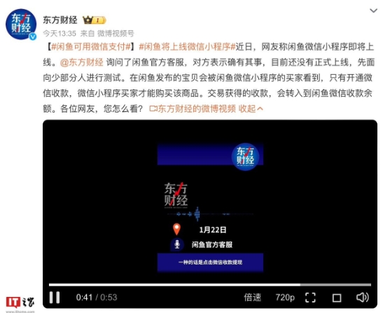 微博出現“閑魚(yú)可用微信支付”話(huà)題,流傳截圖展示有“閑魚(yú)微信小程序即將上線(xiàn),快來(lái)開(kāi)通微信收款”字樣。