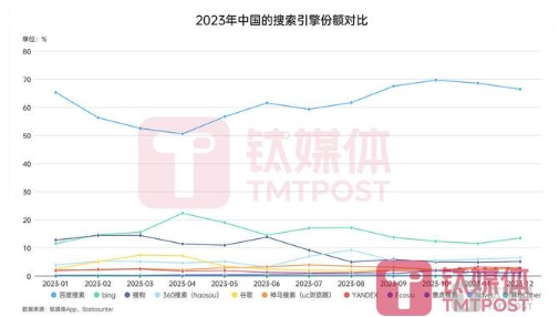 據Statcounter最新數據顯示,截至2023年12月,百度在中國的搜索引擎市場(chǎng)份額為66.52%,排名第一;必應國內版份額為13.32%,360搜索排名第三,份額為6.43%,超越了騰訊的搜狗5.01%的搜索份額。
