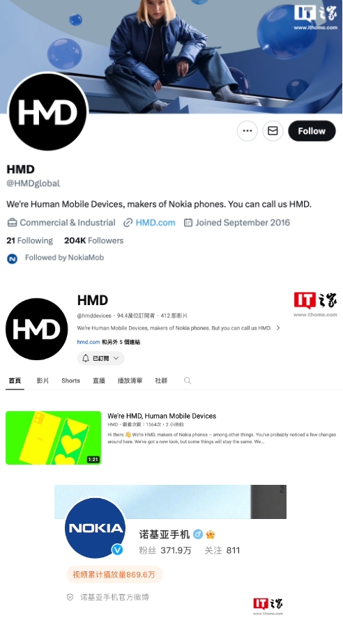 HMD Global 目前已經(jīng)正式“去諾基亞化”,原“NokiaMobile”X 平臺 / YouTube 官方賬號均已經(jīng)改名為“HMD”,不過(guò)微博平臺暫未更名。