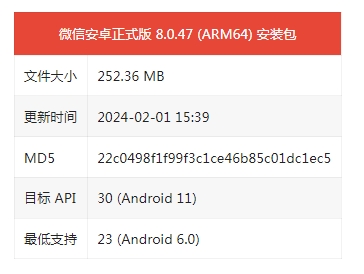 微信安卓平臺迎來(lái)了 8.0.47 正式版更新,本次更新安裝包文件詳細信息如下: