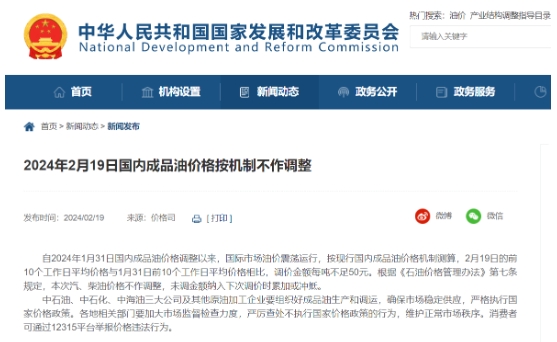 國家發(fā)改委發(fā)布公告,2024 年 2 月 19 日國內成品油價(jià)格按機制不作調整。