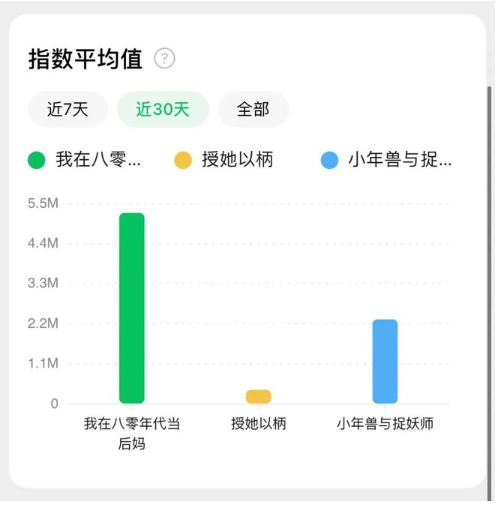 在微信,《八零后媽》30天內指數平均值達523萬(wàn)+,同期短劇《小年獸與捉妖師》、《授她以炳》分別為230萬(wàn)+與37萬(wàn)+。