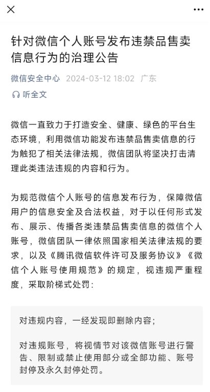 微信安全中心:個(gè)人賬號不得發(fā)布、展示、傳播各類(lèi)違禁品售賣(mài)信息,最嚴重面臨永久封號處罰