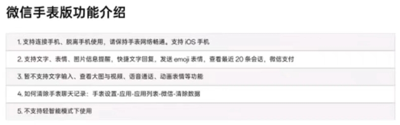 官方補充介紹:該版本微信支持連接手機,脫離手機使用,支持 iOS 手機;支持文字、表情、圖片信息提醒,快捷文字回復,發(fā)送 emoji 表情,查看最近 20 條回話(huà),微信支付;暫不支持文字輸入,查看大圖與視頻,語(yǔ)音通話(huà),動(dòng)畫(huà)表情等功能。