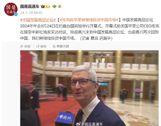 中國發(fā)展高層論壇 2024 年年會(huì ) 3 月 24 日在釣魚(yú)臺國賓館舉行開(kāi)幕式,開(kāi)幕式前美國蘋(píng)果公司 CEO 庫克在接受采訪(fǎng)時(shí)表示,“我很高興來(lái)到中國發(fā)展高層論壇,也很高興再次回到中國,我們將繼續投資中國市場(chǎng)。”