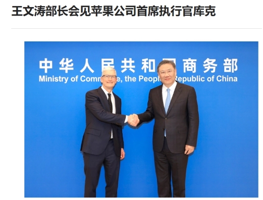3 月 22 日,商務(wù)部部長(cháng)王文濤會(huì )見(jiàn)美國蘋(píng)果公司首席執行官庫克。雙方就蘋(píng)果公司在華發(fā)展、中美經(jīng)貿關(guān)系等議題進(jìn)行了交流。庫克表示,中國人才資源豐富、創(chuàng )新活力強,是蘋(píng)果公司的重要市場(chǎng)和關(guān)鍵供應鏈伙伴。蘋(píng)果公司將繼續致力于在華長(cháng)期發(fā)展,持續加大對中國供應鏈、研發(fā)和銷(xiāo)售的投入。