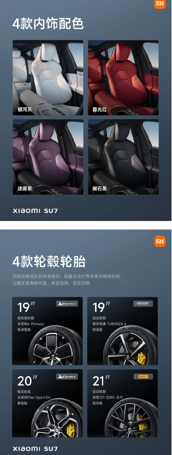 小米 SU7 內飾共提供了 4 款配色可選,分別是銀河灰、暮光紅、迷霧紫色、和曜石黑,靈感均取自大自然。還提供 4 套輪轂輪胎可供選擇,最大 21 英寸。